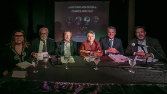 Juristas ligados al kirchnerismo consideraron que existen motivos suficientes para destituir al presidente Javier Milei, al tiempo que afirmaron que no quieren que “se vaya en helicóptero sino destituido en el Congreso por los delitos que está cometiendo”.