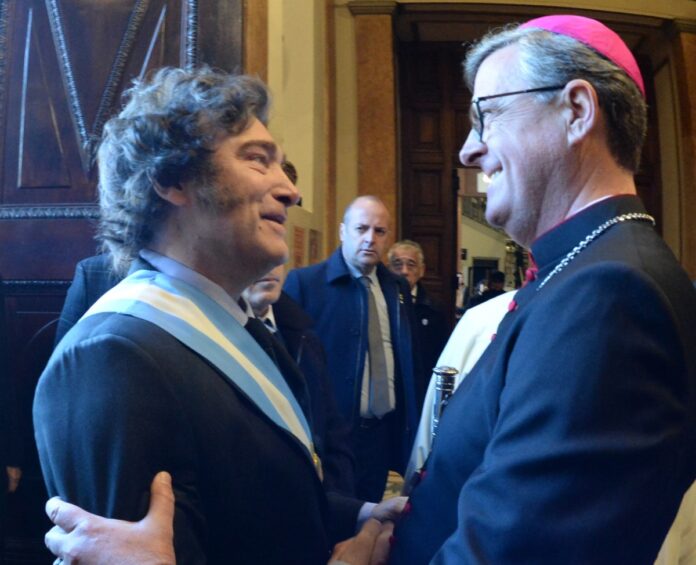 Javier Milei participó este sábado del Tedeum del 25 de Mayo en la Catedral porteña junto a la vicepresidenta Victoria Villarruel y todo su gabinete, incluido el cuestionado Nicolás Posse. El Presidente escuchó el duro discurso del arzobispo porteño, monseñor Jorge García Cuerva, en el que el primado aseveró: “Nuestra gente está haciendo un esfuerzo muy grande”. En horas del mediodía partió rumbo a Córdoba para hablar en un acto en el Cabildo que reemplazará al frustrado Pacto de Mayo con los gobernadores. El evento se transformó en una presentación del mandatario junto a sus ministros.