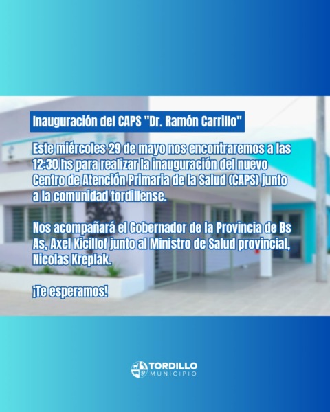 Te esperamos este miércoles 29 de mayo desde las 12:30 hs para inaugurar el Centro de Atención Primaria de la Salud (CAPS) de Tordillo.