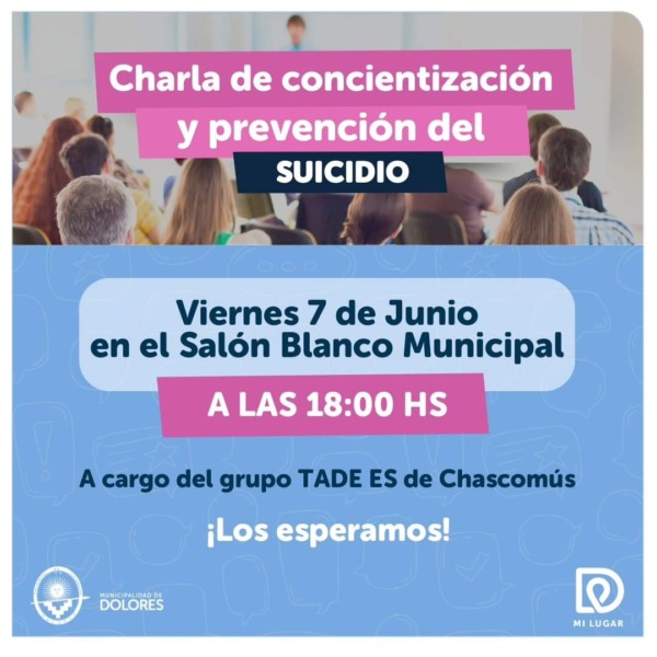 El viernes 7 de junio a las 18.00 horas, en el Salón Blanco Municipal, se llevará a cabo una charla de concientización y prevención del suicidio, a cargo del grupo TADE ES de Chascomús.
