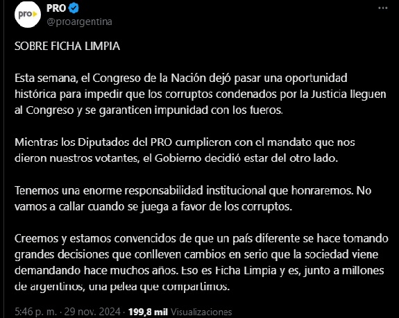 Con el malestar a flor de piel por la trunca sesión del jueves donde se iba a tratar ficha limpia y que dejó al proyecto sin tratar en el período ordinario, el Pro publicó un comunicado en X en el que responsabilizó al Poder Ejecutivo: “Mientras los Diputados del Pro cumplieron con el mandato que nos dieron nuestros votantes, el Gobierno decidió estar del otro lado”.