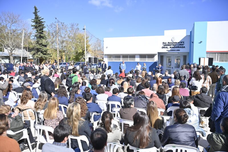 El gobernador de la provincia de Buenos Aires, Axel Kicillof, encabezó ayer martes el acto de inauguración formal del nuevo edificio de la Escuela de Educación Secundaria N°5 de General Madariaga, junto al director general de Cultura y Educación, Alberto Sileoni; el intendente local, Esteban Santoro; y la directora de la institución, Gabriela Kopciuch. Además, entregó patrulleros y firmó un convenio para financiar obras de infraestructura social y urbana en el barrio Belgrano.