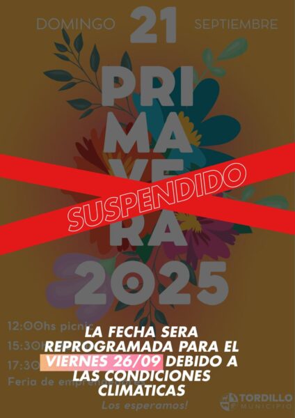 Debido a los pronósticos de lluvia para los próximos días, informamos que los festejos por el Día de la Primavera han sido reprogramados.
