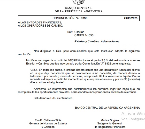 La autoridad monetaria publicó este viernes la Comunicación “A” 8336 que modifica las normas cambiarias. La restricción que introdujo el directorio de la entidad que conduce Santiago Bausili no es desconocida para los operadores y ahorristas locales: supo estar vigente durante los últimos episodio de controles de cambio, la era de “cepo cambiario”.