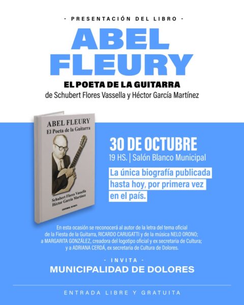La Municipalidad de Dolores invita a la presentación del libro “Abel Fleury, el poeta de la guitarra”, escrito por Schubert Flores Vassella y Héctor García Martínez. El evento se realizará el jueves 30 de octubre a las 19 horas en el Salón Blanco Municipal, con entrada libre y gratuita.