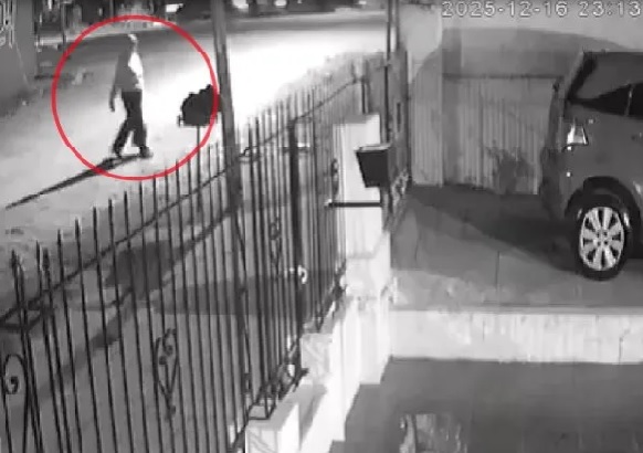 En las imágenes se observa a una mujer encapuchada, cruzando la calle de tierra con una bolsa de tela en la mano izquierda. A pocos metros, se agachó y dejó la bolsa sobre una zanja cubierta de pastizales para luego retirarse rápidamente de lugar.
