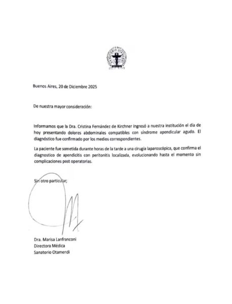 El documento difundido por el sanatorio precisó que Cristina Kirchner fue sometida durante la tarde a una cirugía laparoscópica que confirmó una apendicitis con peritonitis localizada. La intervención se realizó sin inconvenientes y el resultado fue favorable.