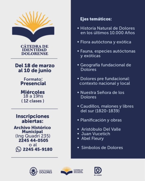 La Municipalidad de Dolores informa que continúa abierta la inscripción a la Cátedra de Identidad Dolorense, un ciclo de 12 clases magistrales diseñado para profundizar en las raíces, el patrimonio y el futuro de nuestra comunidad.