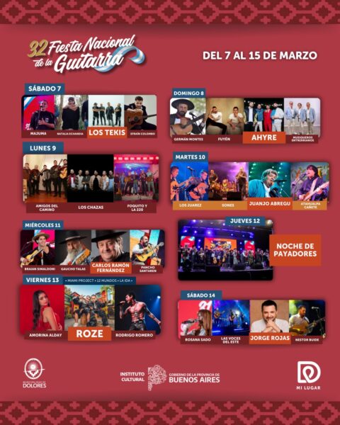 La grilla de esta edición de la Fiesta Nacional de la Guitarra reúne artistas altamente reconocidos a nivel nacional e internacional, con premios, nominaciones y presencia en los principales escenarios del país. Incluye ganadores y nominados a Premios Gardel, artistas consagrados en Cosquín, representantes argentinos en festivales internacionales como Viña del Mar, bandas como Roze con millones de reproducciones en Spotify y YouTube, y voces surgidas de programas televisivos de alcance masivo. A esto se suma una fuerte presencia de referentes del folclore tradicional, el canto surero, la guitarra criolla y la improvisación payadoril.