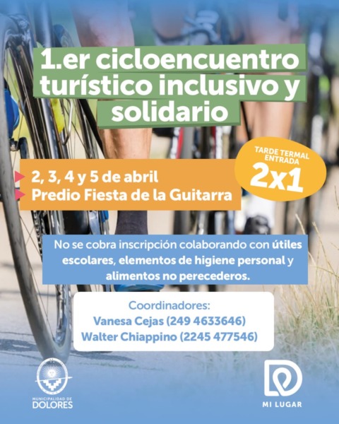 La Municipalidad de Dolores invita a participar del Primer Cicloencuentro Turístico, Inclusivo y Solidario, que se llevará a cabo los días 2, 3, 4 y 5 de abril con sede en el predio de la Fiesta Nacional de la Guitarra.